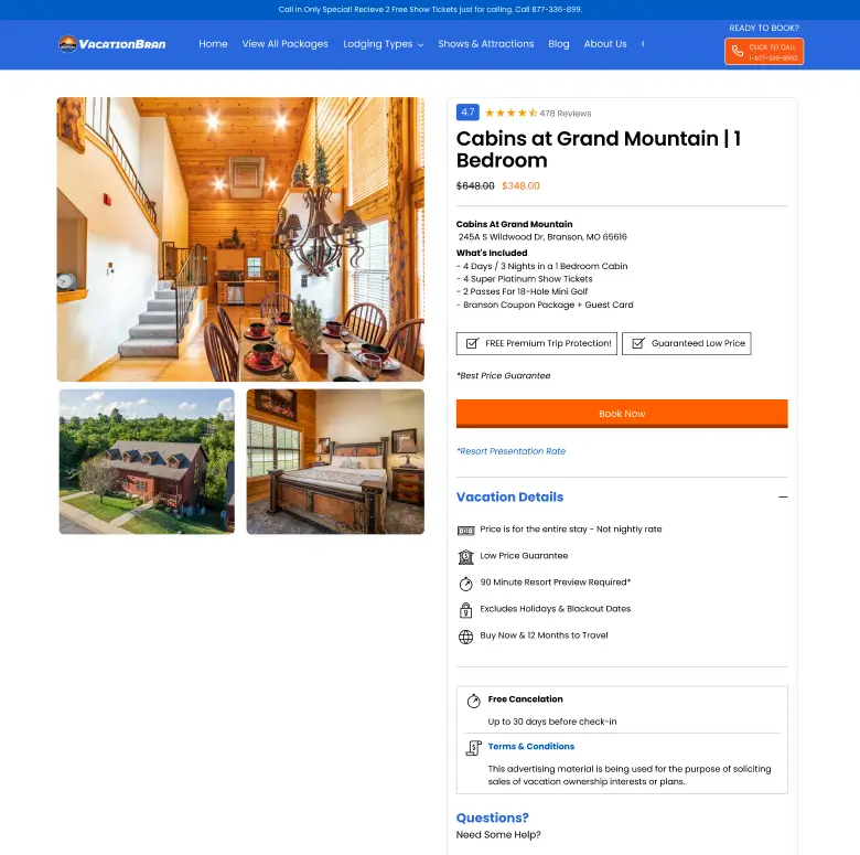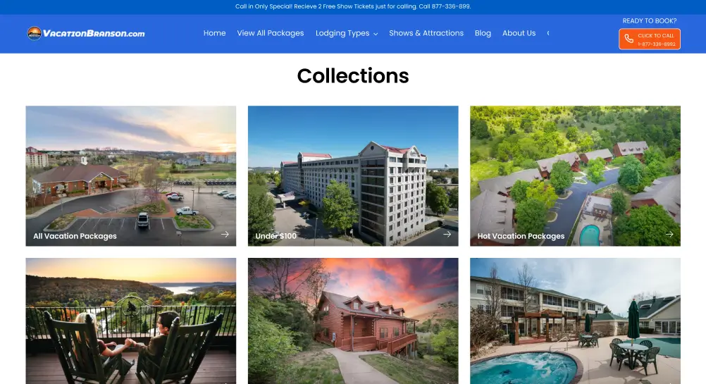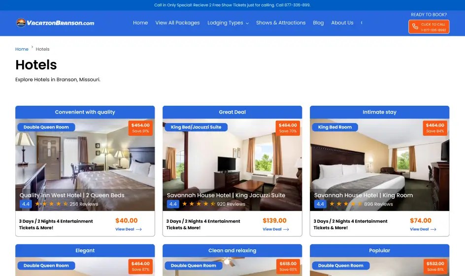 Vacation Branson is the best place to book your perfect trip at great prices. Whether you want entertainment, outdoor fun, or a relaxing stay, we offer big discounts—save up to 80%! Find top attractions, great hotels, and exciting activities all in one place for an amazing and affordable vacation.